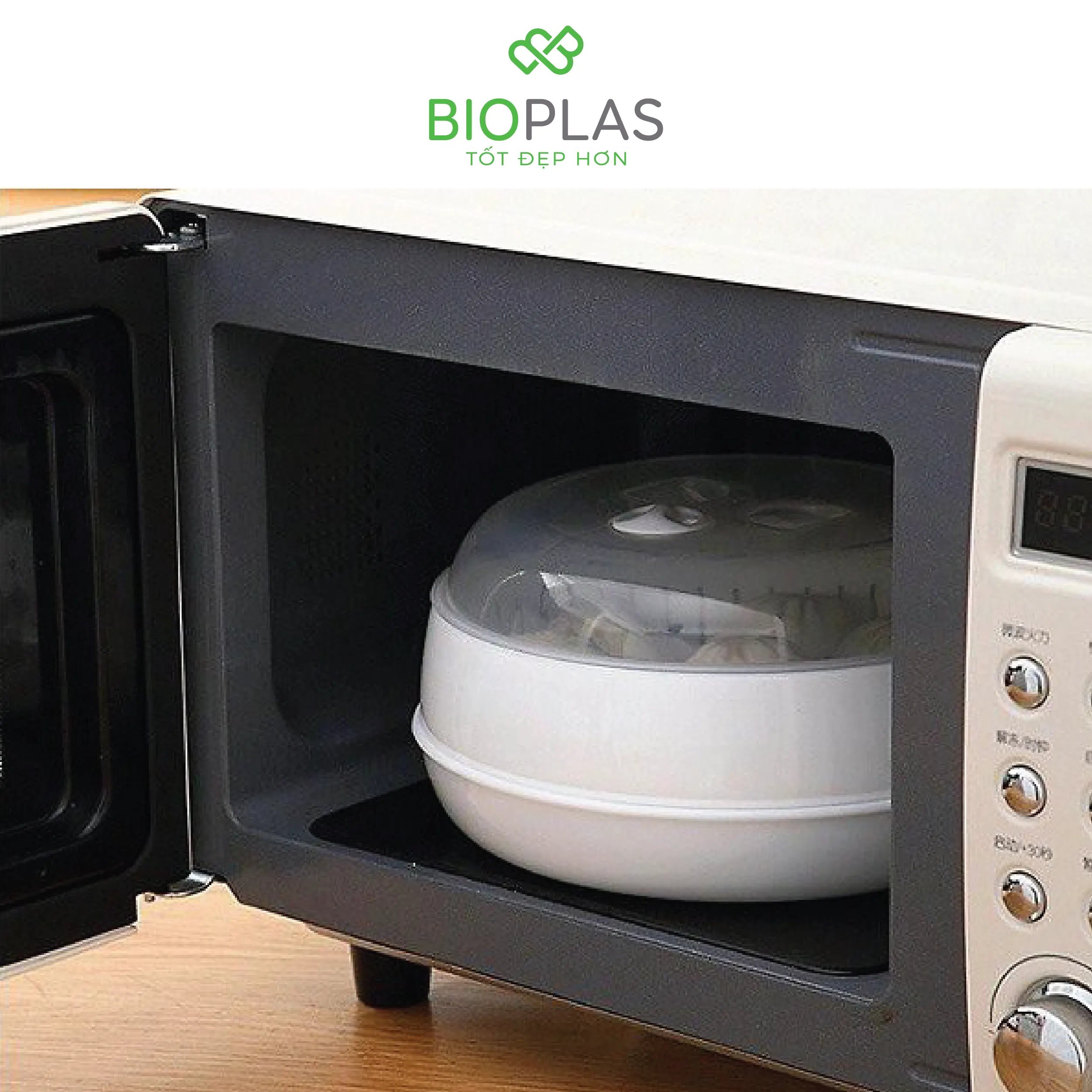- Bộ khay hấp Biohome được dùng hấp các loại thức ăn: rau, cá, bánh bao,…trong lò vi sóng. Chỉ cần cho thực phẩm vào khay, thêm nước và đặt vào lò vi sóng, bạn có thể thưởng thức những món ăn ngon trong vòng vài phút.