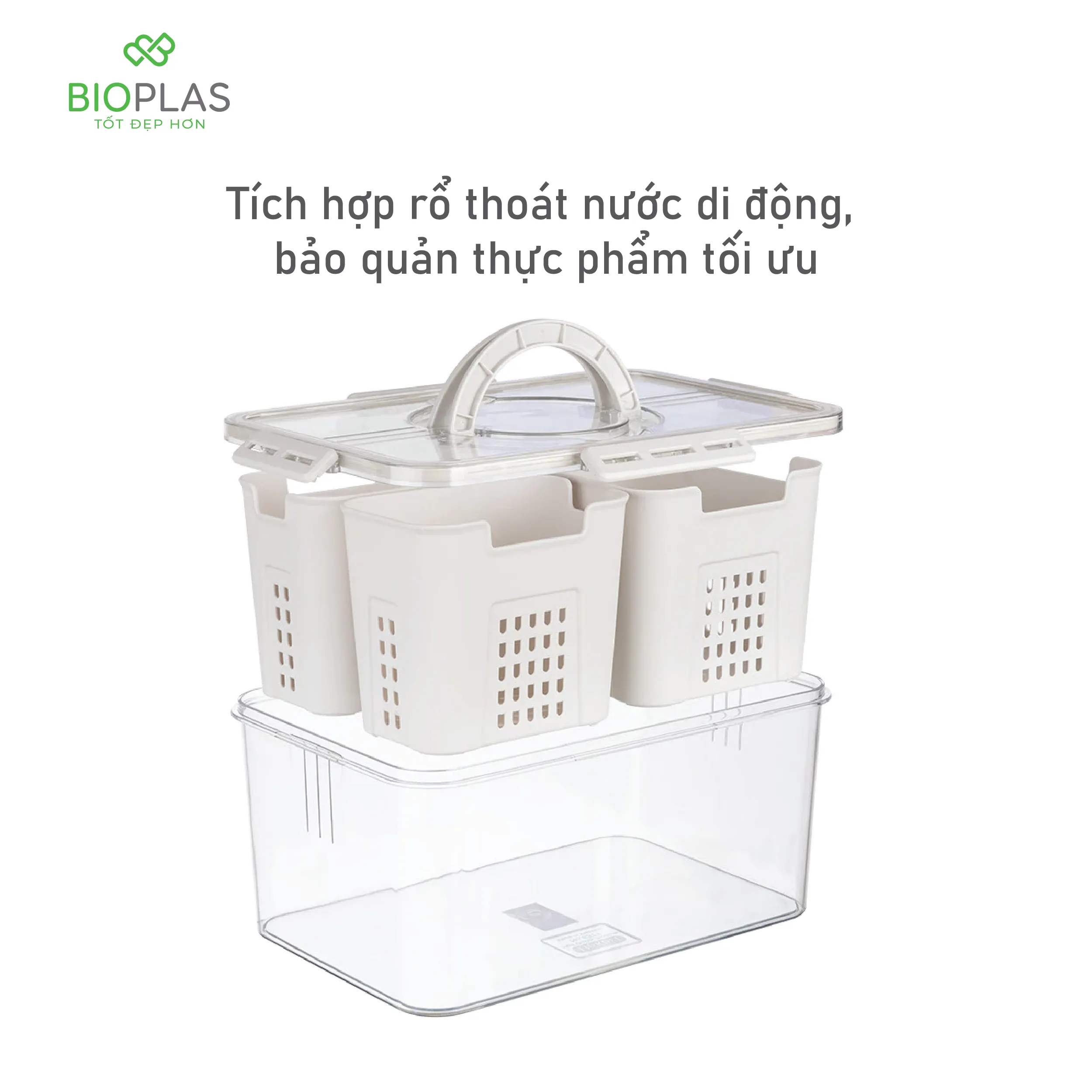 Tiện lợi: Hộp có nắp đậy kín đáo, chống tràn hiệu quả, có nút thông hơi giúp thoáng khí, có rổ thoát nước đi kèm giúp bảo quản thực phẩm tươi ngon trong thời gian tương đối dài mà không lo bị lẫn mùi. Thân hộp trong suốt có thể thấy được bên trong.